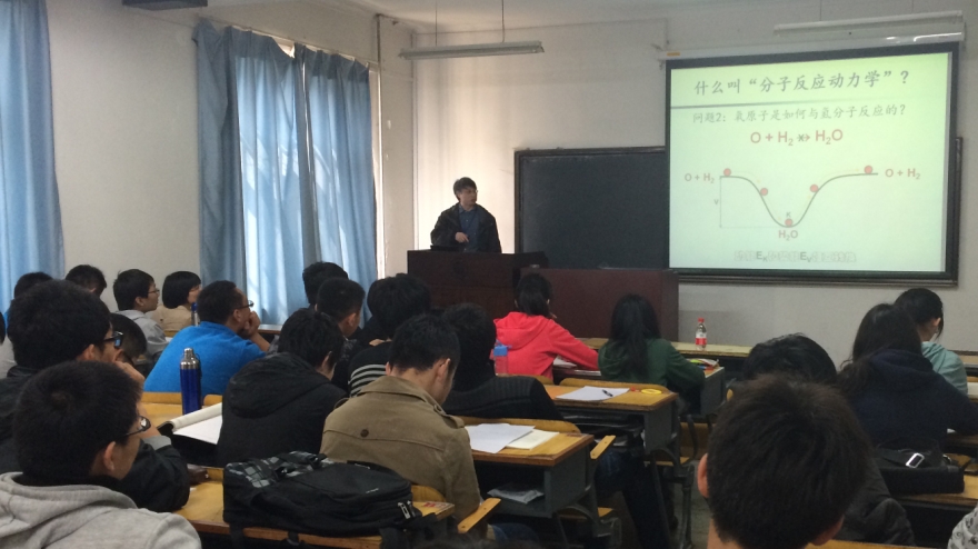 戴东旭研究员从分子反应动力学角度为王大珩班的学生进行授课,对原子、分子的层次上,不同状态下和不同分子体系中单分子的基元反应的动态结构、反应过程和反应机理等进行分析。