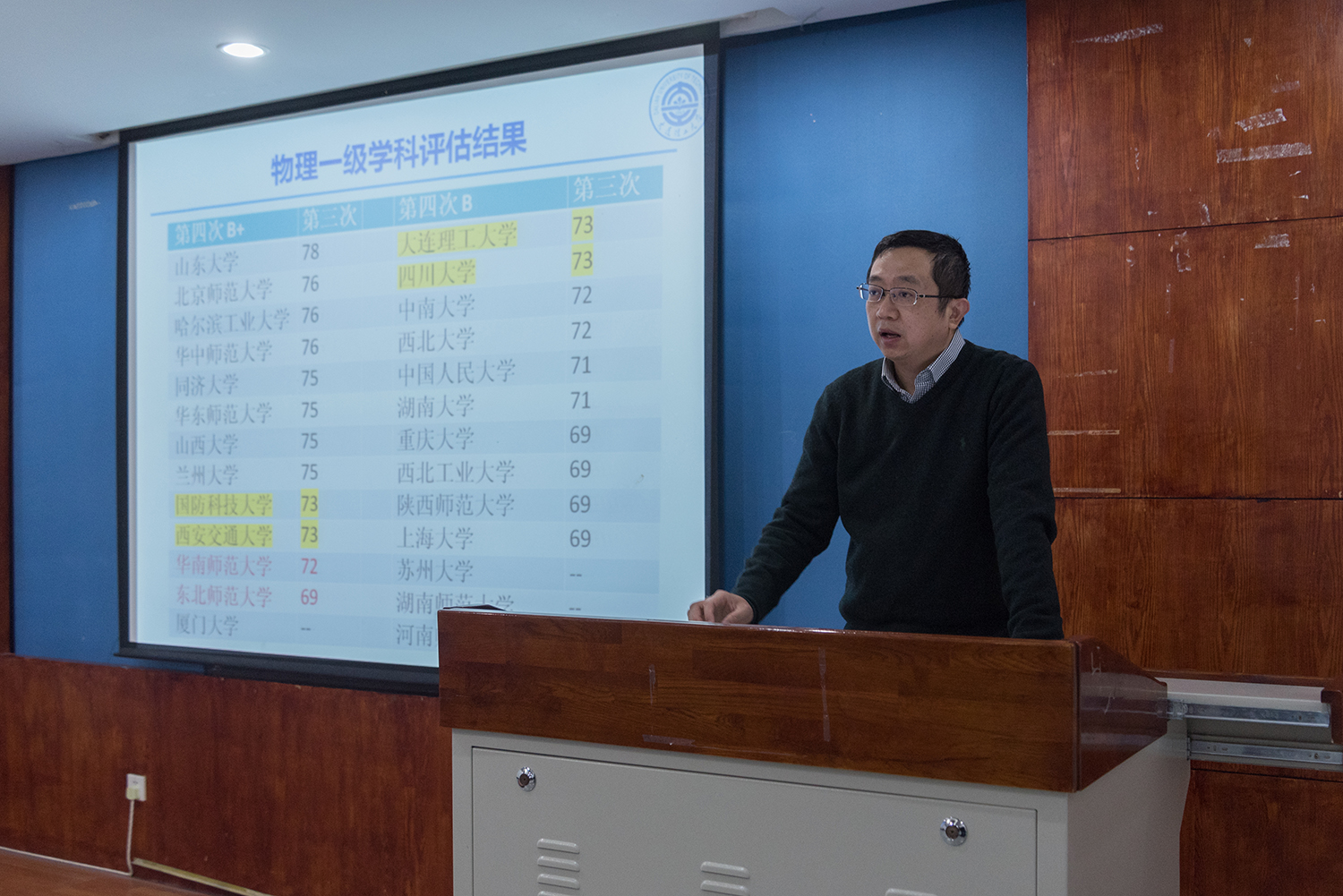 会议由院长赵纪军主持并做主旨报告《第四次学科评估结果分析及我们该如何应对》。报告详细分析了我校物理学一级学科在近两次学科评估中的排名走势,并结合本次评估中的各项指标性数据,探讨了当前物理学科建设工作中存在的问题。针对学科存在着“国家级人才数量不足”“缺乏省部级以上科研团队”“获得的科技奖励少”“ESI被引论文数量少”“发表在物理类高水平刊物的论文少”等一系列问题,提出了“继续引进和培养优秀青年人才,积极冲击各种国家级计划人才”“多渠道争取保持物理学科的硕博招生名额,同时提高研究生培养质量”“鼓励师生发物理类刊物及高被引论文”“组织申报省部级奖励,包括与外单位联合申报”“积极争取规划教材,注意积累教学相关各项指标”的5项基本对策,得到在场教授们的广泛认可。