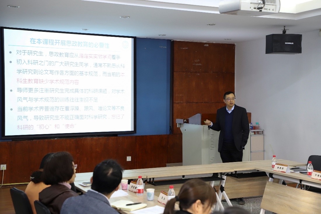 开云网页版院长赵纪军在会上做《“学术规范与写作”校级课程思政示范课经验介绍》报告,结合“弘扬科学精神、提升学术品味、普及学术规范、恪守学术道德”四个课程核心理念,详细讲解了该门课程的主要内容与目标效果。