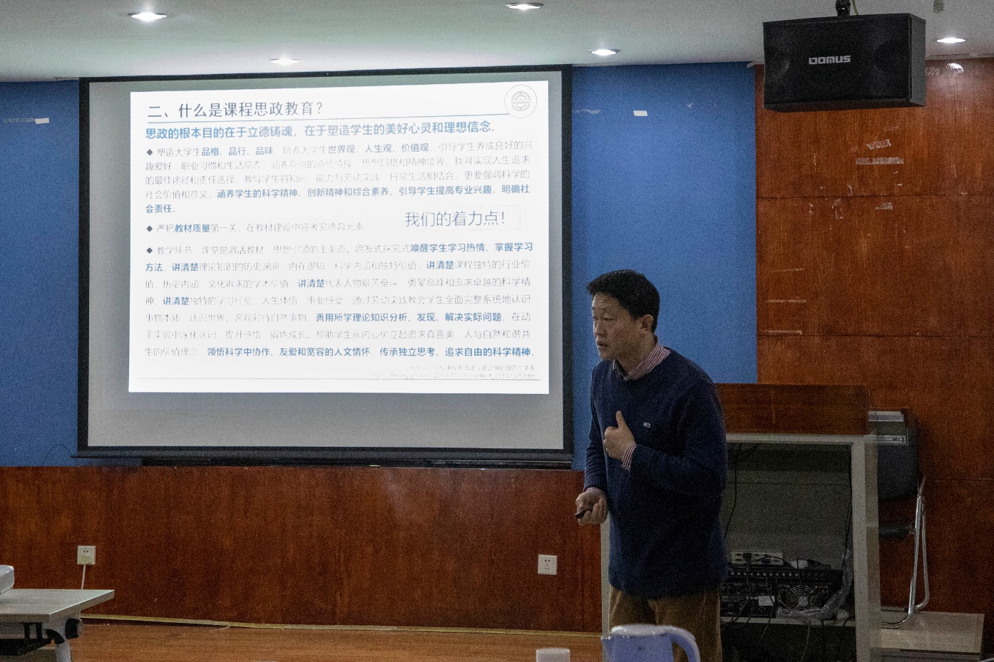 专题报告结束后,学院教师踊跃参入到课程思政经验交流讨论环节,结合报告内容和自身教学实践经验轮流发言。交流讨论环节场面热烈,教师参与度极高,大家就课程思政在立德树人中的作用、内容体系建设及其融入方式、教学模式与教学方法、教师队伍建设等方面展开了深入的讨论。