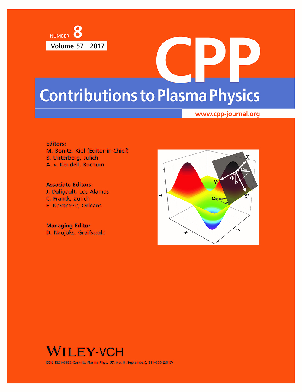近日,开云(中国)官方等离子体物理专业硕士生石权关于托卡马克边界杂质返回等离子体区域的角度分布研究工作被国际著名出版公司Wiley出版的等离子体技术类期刊《Contributions to Plasma Physics》选为2017年第8期封面文章。