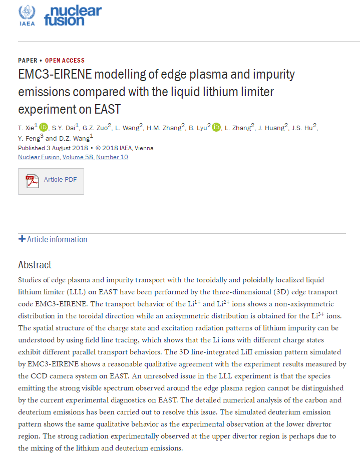 近日,开云(中国)官方等离子体物理专业博士生谢添在王德真教授和戴舒宇副教授指导下的最新科研成果(核聚变装置EAST中边界锂杂质输运和辐射的三维模拟研究)发表于核聚变领域顶级期刊Nuclear Fusion。从文章正式发表至今,短短不到一个月的时间内,文章的下载量和阅读量成为了Nuclear Fusion期刊Most read排行榜的第一名。具体图文如下: