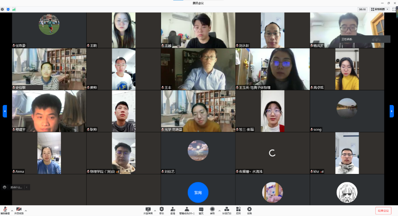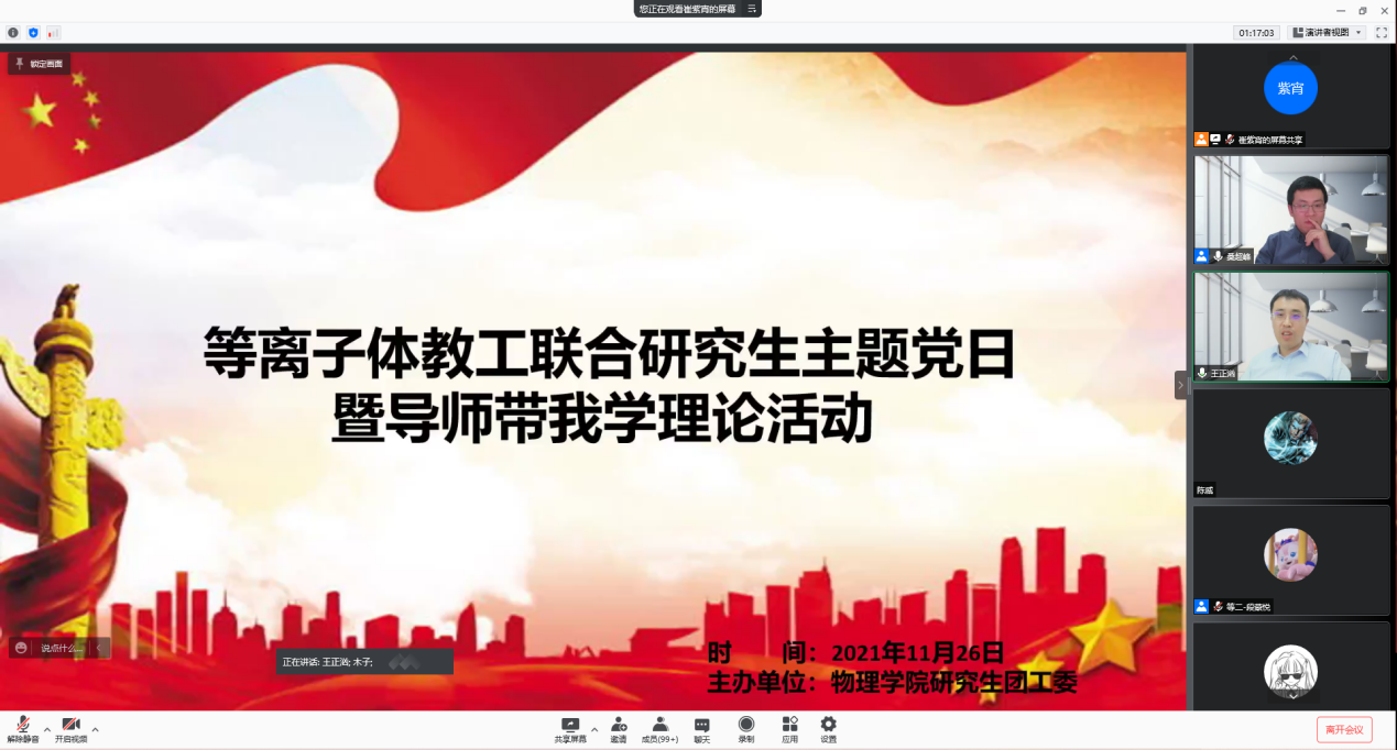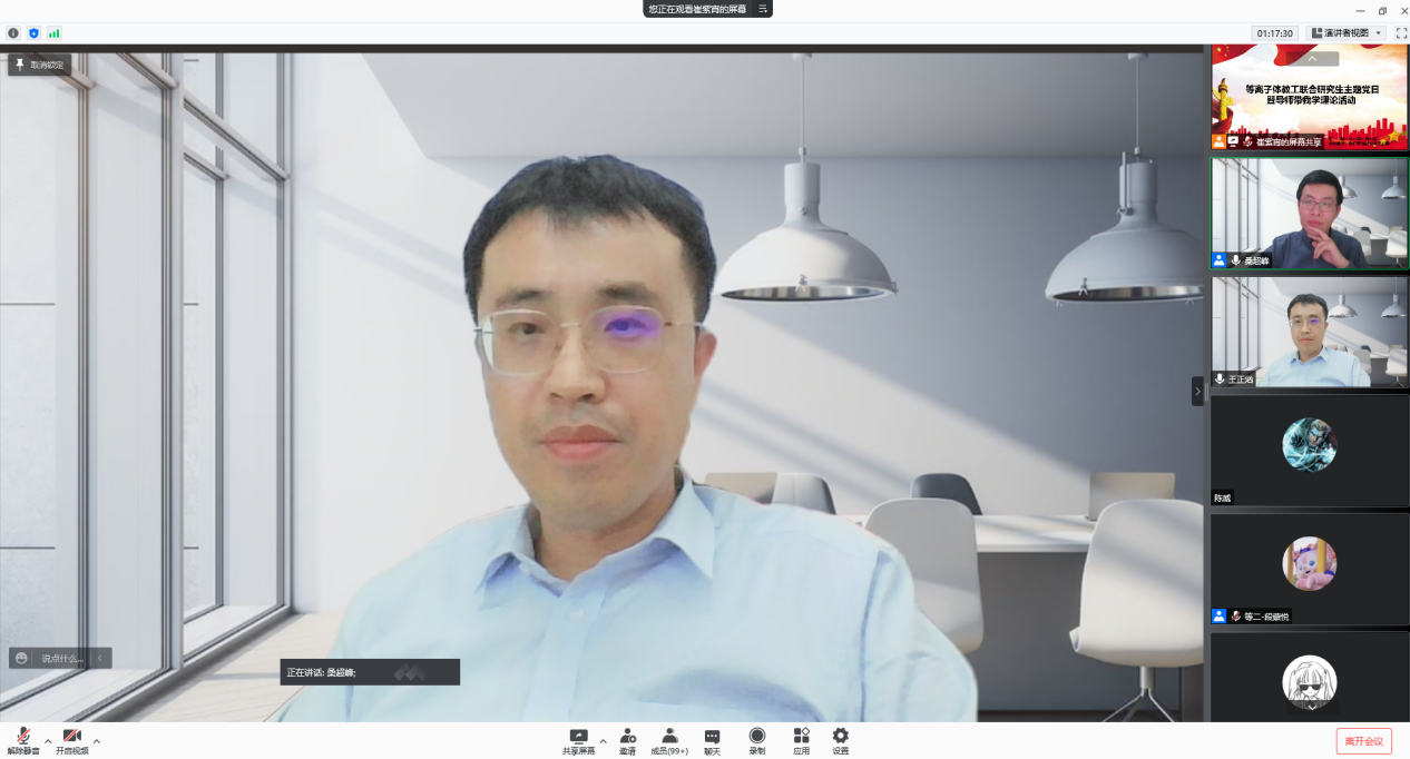 为响应学院党委关于加强深入学习党的十九届六中全会精神要求,发挥基层党支部宣传群众职能。同时为及时了解并解决疫情期间研究生遇到问题,2021年11月26日,开云(中国)官方等离子体物理教工和硕博学生党支部通过腾讯会议开展了以学习党的十九届六中全会精神和解决疫情“封校”期间问题的联合主题党日活动。等离子体物理教工党支部书记桑超峰教授讲解了党的十九届六中全会的主要内容并和相关精神,三名等离子体学生党支部书记对疫情期间研究生心理、科研等方面存在的问题进行反馈,开云(中国)官方党委书记王正汹教授、副院长高飞教授等对疫情封校后同学们反映的所遇到的问题予以解答并提出应对方法。活动受到老师同学积极响应,共有187人参会,其中老师25人,学生162人。