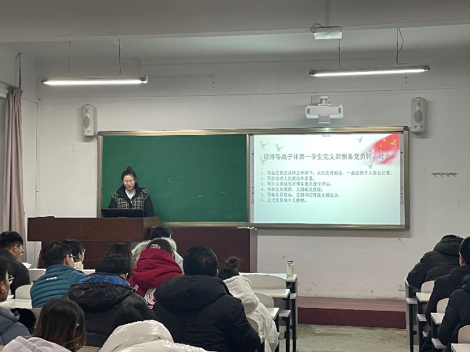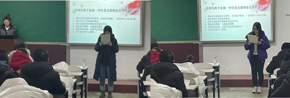 会议第一项:对预备党员宫丽悦、李瑶、杜满强、李茜四位同志转正的讨论与表决。首先四位同志依次宣读了转正申请书,汇报了在预备期内在党支部和入党介绍人的考察培养和教育过程中自己发生的改变,深刻剖析了自己还存在的不足和改进措施,表明了想成为正式党员的决心,表示将进一步接受党组织考察。其次他们的入党介绍人分别介绍该同志在预备期内的表现和存在的不足,对其是否能够转正发表意见。支部成员对其进行评议,到会正式党员进行充分讨论后,对四位同志能够转正进行无记名投票表决。最后,四位同志全票通过表决,按期转正成为了中共党员,他们对以后如何做一名合格的共产党员、如何在日常生活和工作中发挥先锋模范作用等方面发表了感想。