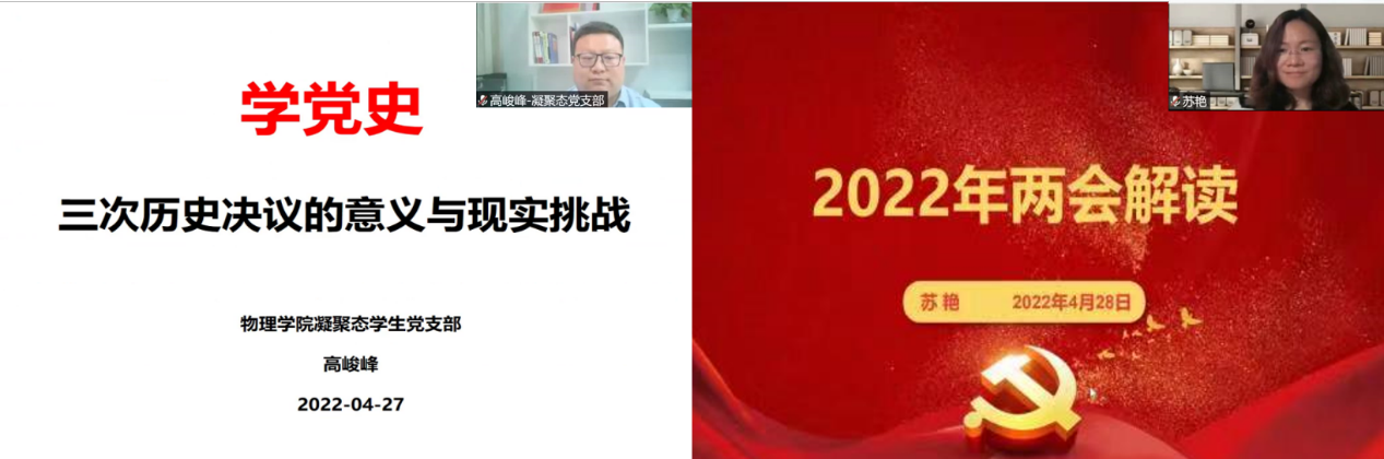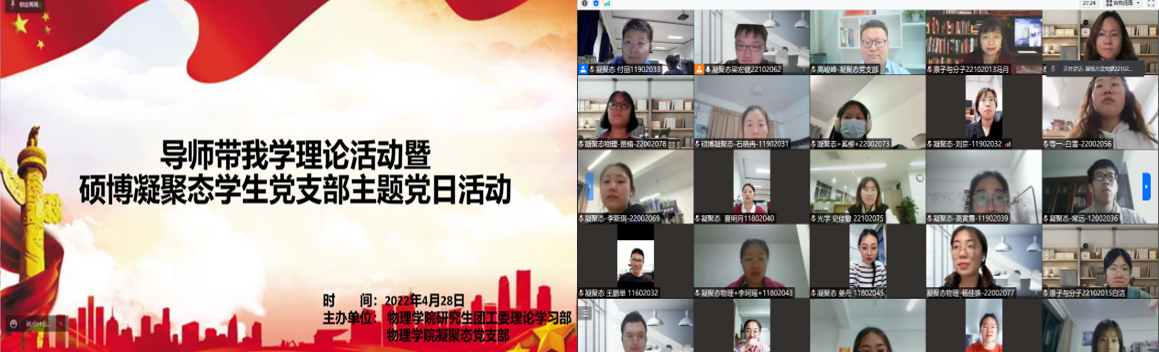 在这个特殊节点,开云(中国)官方硕博凝聚态学生党支部协同开云(中国)官方研究生团工委于4月28日晚顺利开展主题党日暨导师带我学理论活动。本次活动特邀请中白学院副院长高峻峰老师、开云(中国)官方凝聚态与理论物理教工党支部书记苏艳老师带领大家回顾我党历史上三次历史决议,领会两会精神。激励同学们走好全面建设社会主义现代化国家新的赶考之路,以实际行动迎接党的二十大胜利召开。本次党日活动受到学院老师同学积极响应,超过八十人参与本次活动,凝聚态支部全体党员参与活动。