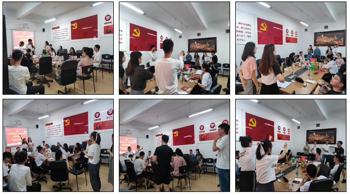 第二个环节由秦俊飞主持。活动过程中,将党团知识与“你比划我猜”相结合。由主持人宣布游戏规则,每组选出两名成员进行比划描述,其余成员进行猜词。石头剪刀布获胜队伍优先抽取题目,每组会拿到12个词语,按照给定的词语依次比划,比划者可以用肢体语言和口述的表达形式向猜词者传达信息,但是不得说出词语中带有的字,说出一字加10s,最终用时最短的三组为前三名。游戏中选择“改革创新”“中国梦”“两学一做”“一带一路”“两弹一星”等一百余个相关词汇,有利于加深支部成员们对新中国发展过程中理论知识的掌握,现场气氛非常活跃。
