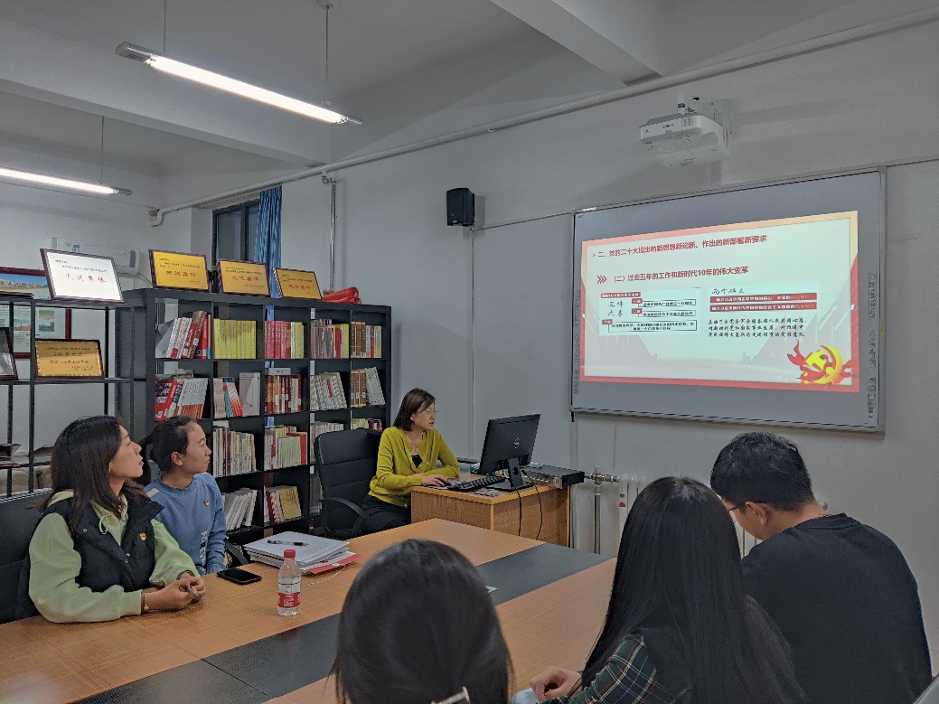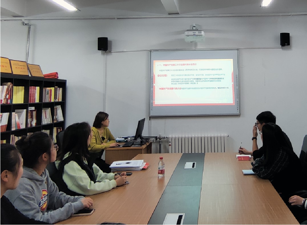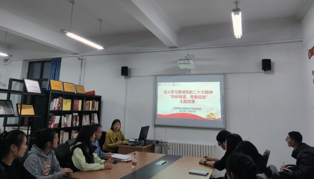 为进一步深入学习党的二十大精神,引导支部党员坚定理想信念,按照学院党委关于“深入学习宣传贯彻党的二十大精神”的部署安排,硕博光学学生党支部于2022年11月23日下午17:00在物理楼422会议室召开党员大会,特邀学院党委副书记于艳敏老师为支部讲了一堂题为“深入学习贯彻党的二十大精神——‘科研有道,青春绽放’”的主题党课,支部全体党员参加了此次党课学习。
