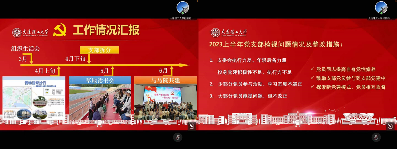 支部书记代表支委会向大会报告了支部半年来的工作情况:2023年依托“三会一课”制度,支部积极推进并落实学校“一融双高”建设,联合其他党支部举办“博物馆奇妙日”“草地读书会”“情景模拟”等特色活动,通过丰富多彩的活动方式积极学习贯彻落实习近平新时代中国特色社会主义思想、党的二十大精神和学校第十四次党代会精神。支部不断创新包括发展党员流程、主题系列活动等党建工作新方法,不断提高支部凝聚力、调动支部党员积极性。随后,支委会查摆支部存在问题并提出整改措施,与会党员对支部半年来的工作给予充分肯定,并提出了宝贵意见。