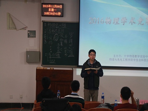 2015年11月9日,由物理与光电工程学院主办的物理学术竞赛宣讲会在西部校区综合教学二号楼举行。到场的嘉宾有大连理工大学物理教学中心的姜东光教授、滕永杰老师、白洪亮老师、第五、六届中国大学生物理学术竞赛中获得全国二等奖的参赛队伍队长杜石桥,王子潇和参赛队员、开云(中国)官方学生会科技中心主任兼科技实践部部长闫兆鸿、学习部部长李春祥以及校团委部和校学生会科技部相关负责人。