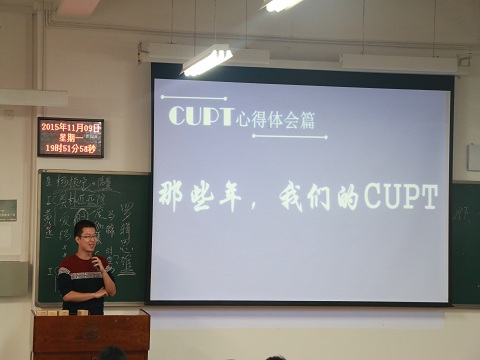 接下来,滕老师为同学们讲解比赛流程,介绍准备工作。滕老师提倡强强联合,优势互补,同时希望同学们早开始多投入。一定要重视伙伴学习,讨论交流以及创新思维的培养,多思考多问为什么,避免片段式学习,尽量深层次的学习。滕老师的讲话给同学们带来了许多专业性的指导。优秀的国赛队员黄子耕,王子潇为同学们带来了他们的经验和技巧,他们用幽默的语言配合幻灯片的展示,分享着参赛心得并号召更多的同学加入到国赛队伍中来。接着,何广鑫为大家播放了国赛的视频片段,让同学们对决赛的辩论形式有了初步的了解。