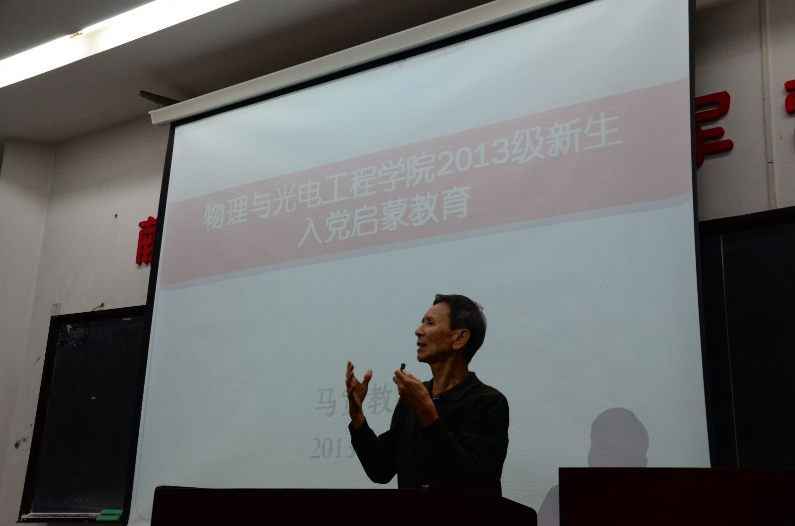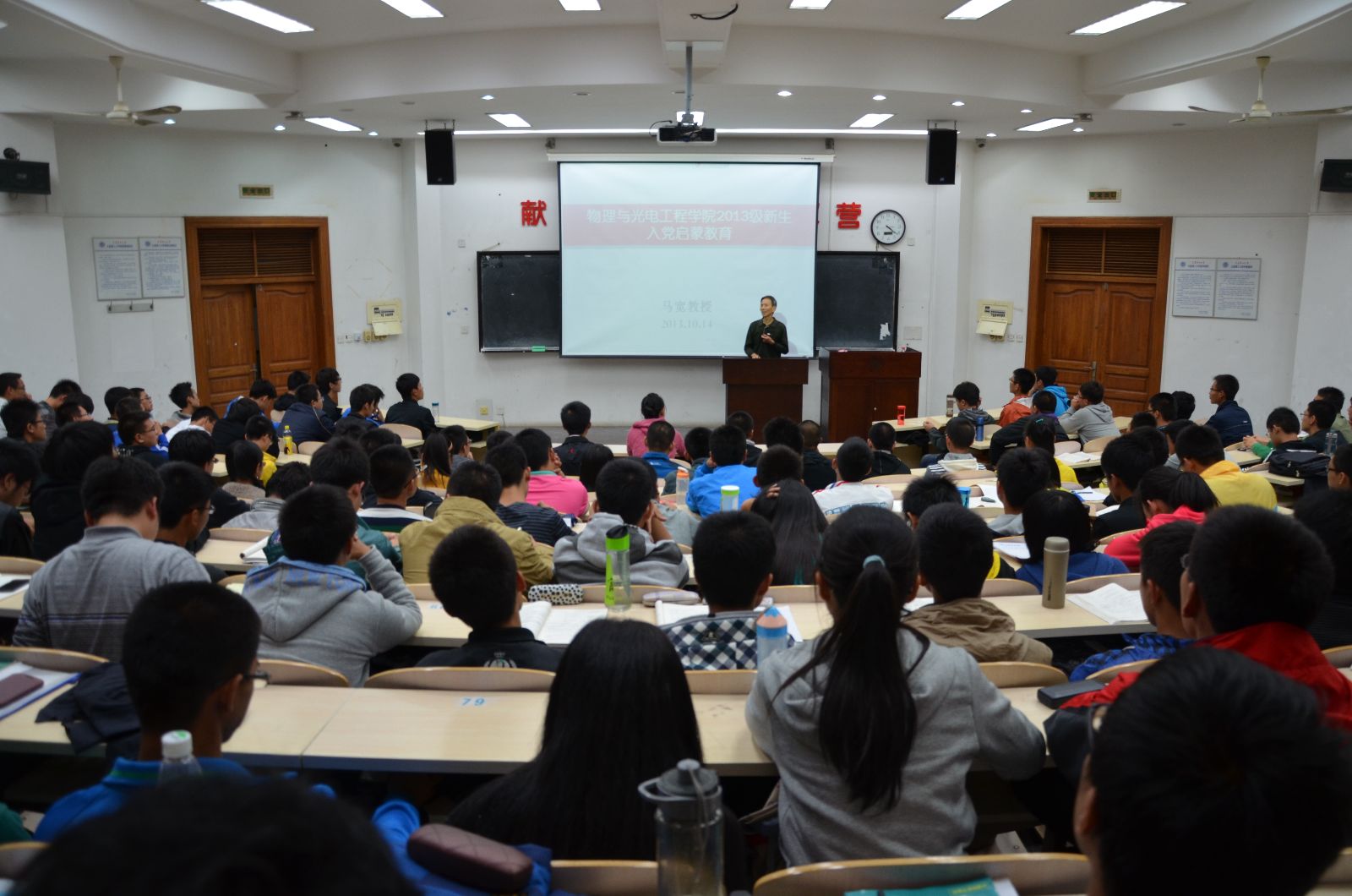 长期以来,入党启蒙教育一直是物理与光电工程学院新生入学教育的重要内容之一。10月14日,学院十分荣幸地邀请到了马宽教授,为开云(中国)官方2013级全体学生开展入党启蒙教育。学院党委副书记兼副院长杨木老师,2013级辅导员俞洲老师出席了本次活动。