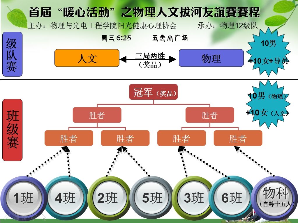 虽说是友谊第一,比赛第二,不过不决出个胜负总还是少了些什么,最后物科1201班与人文10名女生组成的随机方队获得了班级赛的冠军,人文学院在三局两胜的比赛中击败了物理,成功夺冠。
