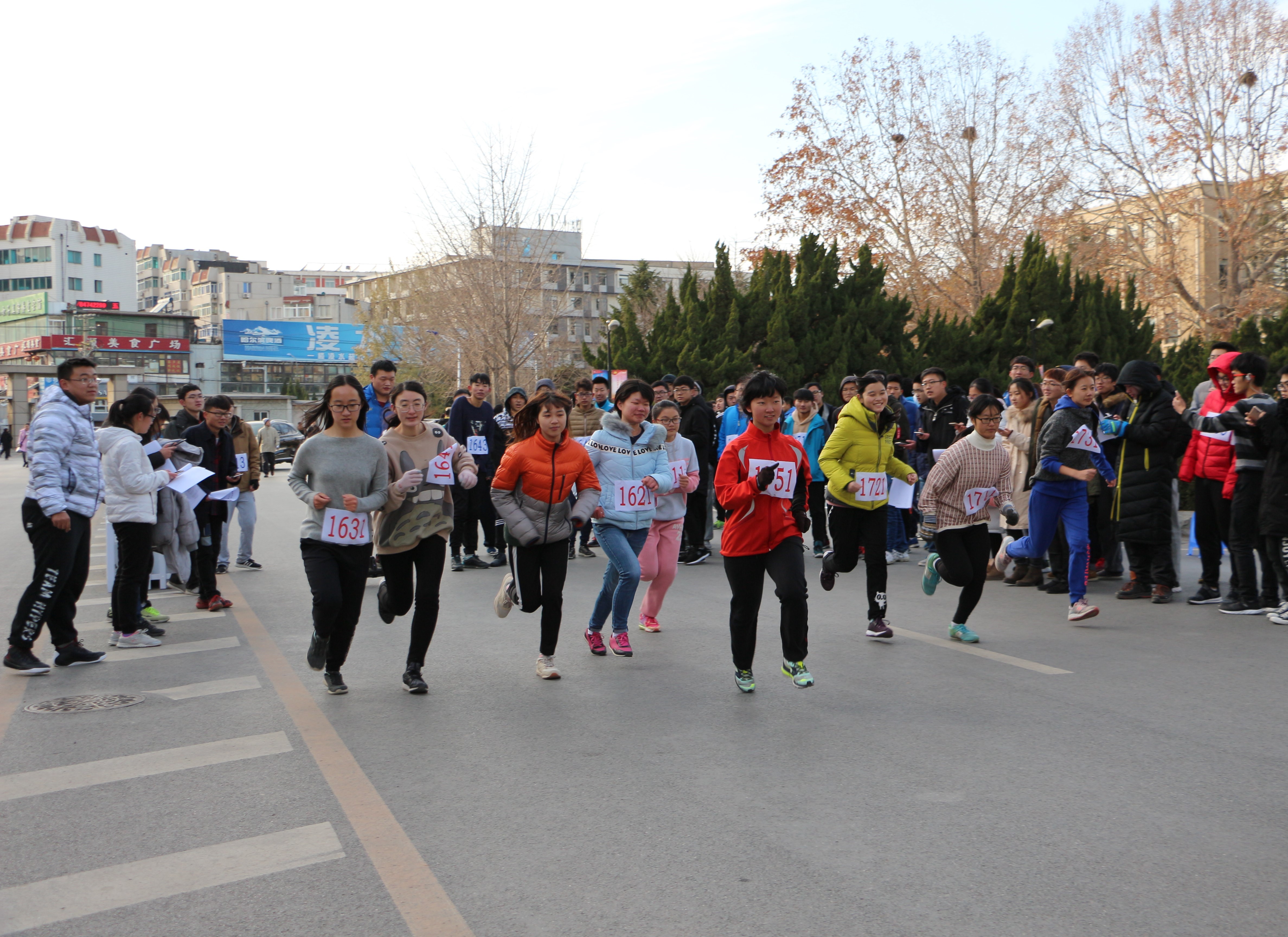 虽然天气很冷,但同学们都热情高涨,早早就来到场地等待比赛的开始。本次比赛采取接力形式,每班派出五位同学参赛。经过紧张的赛前热身与准备,两点整比赛正式开始。第一棒由女生率先上场,每个人都神采奕奕,全然不惧路程漫长。第二棒以后是各班的男生,他们全力以赴,努力为班级赢得荣誉。尽管路程很长,天气十分寒冷,但参加比赛的每一位同学都出色的完成了自己的任务,展现出物理人顽强拼搏的精神与坚韧不拔的意志。现场同学们也纷纷为比赛选手加油助威,并由各部门工作者为选手们提供热水与温暖的食物。