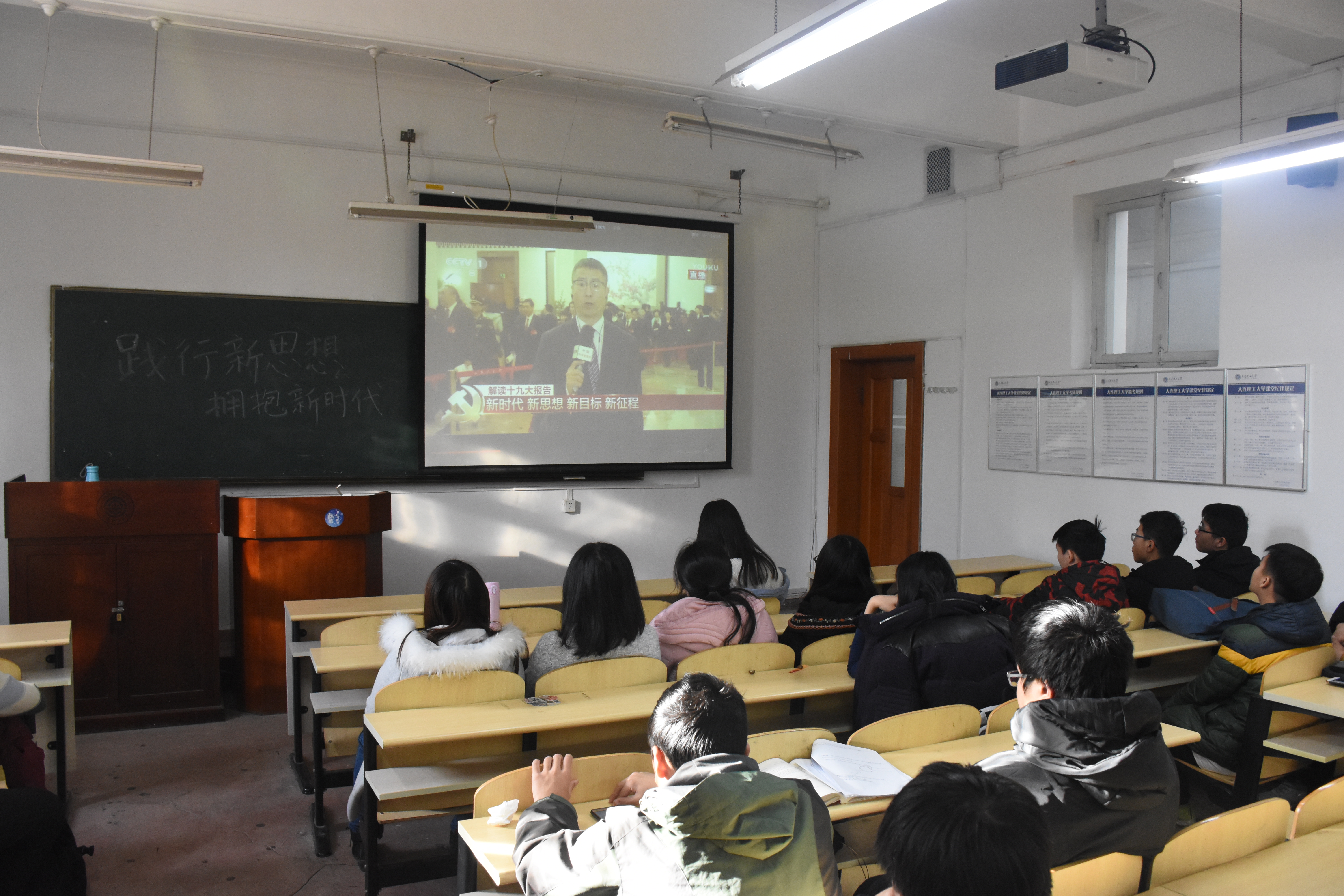 为使本次组织生活会中对党的十九大精神的学习更加高效,纪丹红老师开门见山,向全体共青团员说明本次会议的核心内容和纲要,并以现实生活为例,总结十九大精神中“新思想、新时代”对于同学们的现实意义。紧接着,各教室内优秀团支部团支书组织播放一段央视对党的十九大精神解读的采访。采访中记者白岩松在十九大会议现场总结出党的十九大报告的关键词:新时代。