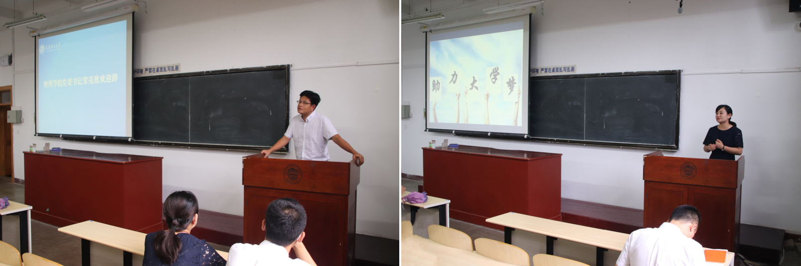 随后,副书记兼副院长杨木老师上台讲话,分析大学和高中学习生活的差异,并在学习、生活和职业三个方面提出实质性的建议。她强调,在学习方面,要养成自学的好习惯;在生活方面,要包容理解室友;在就业方面,要找到属于自己的路。