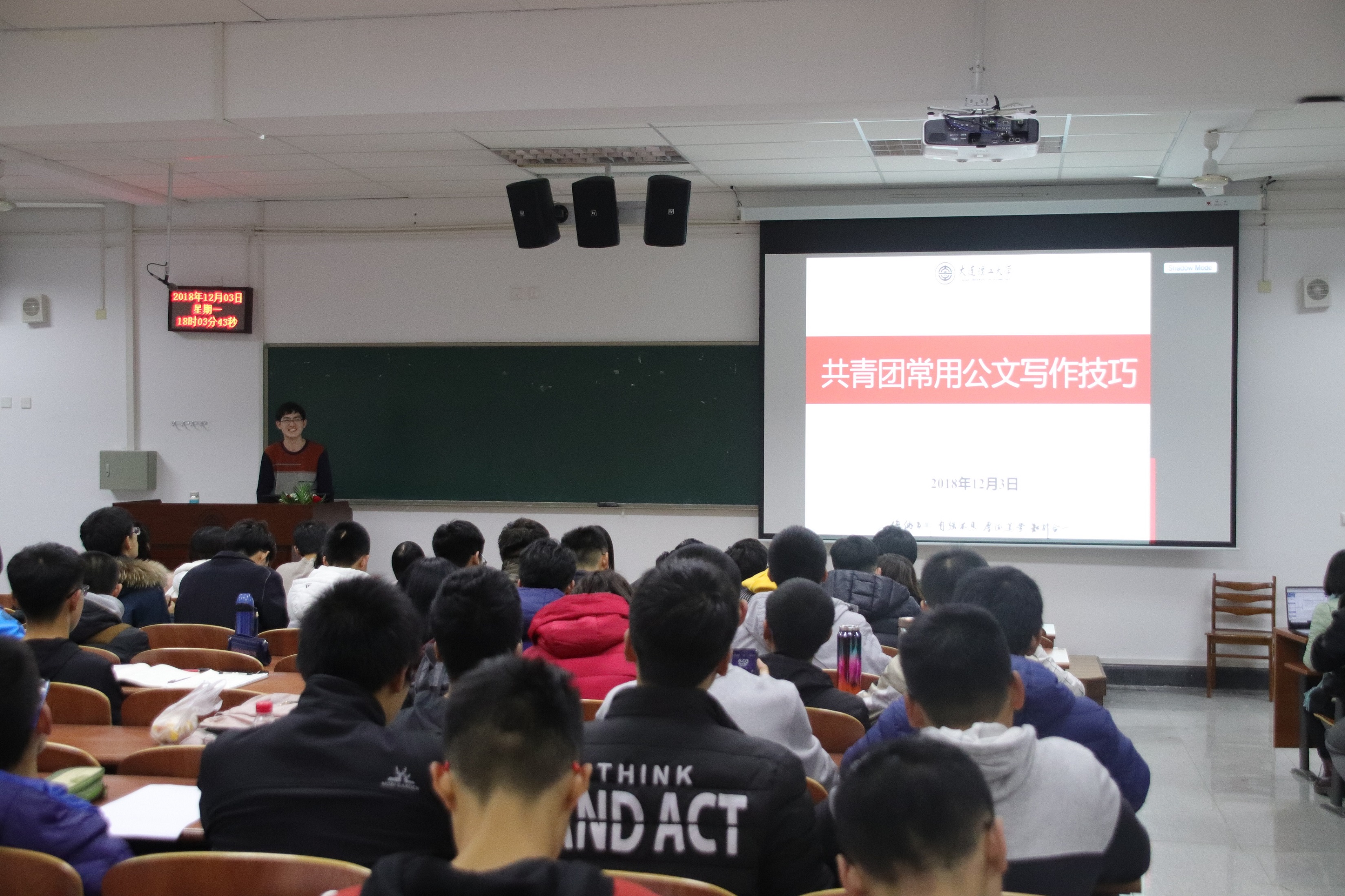 首先,组织部部长何浩向大家介绍共青团常用公文写作技巧。何浩分别从公务文书、事物文书、法规性文书、专用书信、新闻写作、五个方面向大家系统讲解公务文书的写作规范及注意事项。又以新闻写作为例,展示模板具体讲解。最后提出提升公文写作技巧的一些建议。他认为,“规范工整的公文能够准确地传递信息,起到良性的信息沟通作用”。因此,他强调,“写作是一门最基础的课,也是一门最常用的课。其在日常生活中,求职应聘时,工作岗位上都发挥着不容忽视的作用。”其讲解深入浅出,通俗易懂,同学们以热烈掌声表示受益匪浅。
