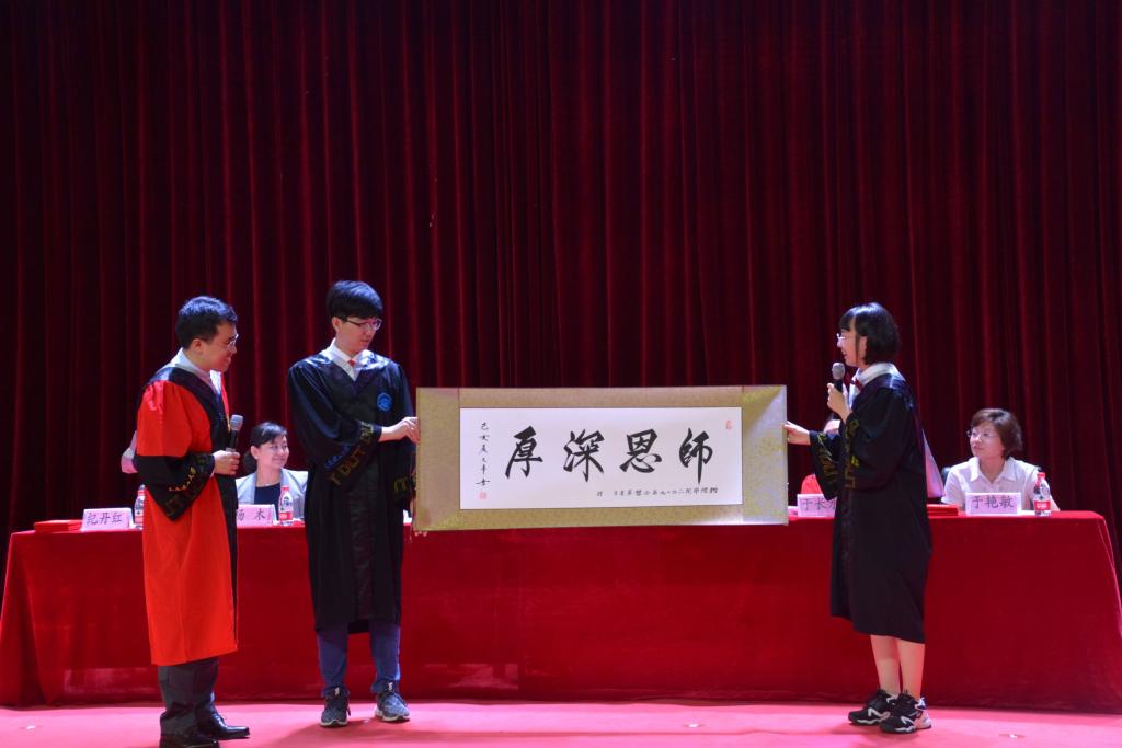在分别之际,学院给毕业学子们准备了礼物,而毕业生们也向学院赠送一幅由一名毕业生书写的书法作品——《师恩深厚》。毕业生代表刘嘉言向老师和学院解释这幅字的意义,它代表全体毕业生对学院老师辛勤栽培的感恩之情,师恩重如山,他们定不会忘记这浓浓的师恩,决心在未来努力拼搏,向着更高的层次迈进,用更灿烂的辉煌,来报答这份不可磨灭的恩情。
