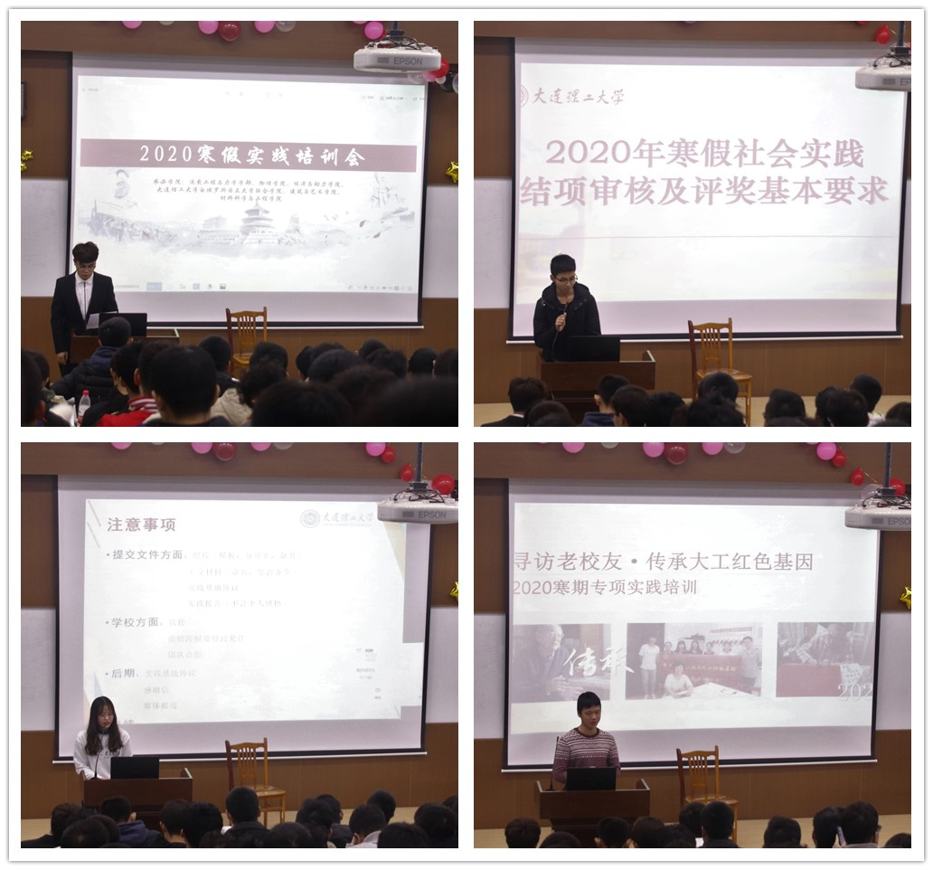2020年1月3日19:30分,大连理工大学2019-2020寒假培训实践会在第二教学馆309教室顺利召开,本次寒假实践培训会由开云(中国)官方、运载工程与力学学部、能源与动力学院、建筑与艺术学院、材料科学与工程学院、中白学院共同举办,旨在对寒假进行实践活动的同学进行培训,让同学们对寒假实践过程中的注意事项有明确的了解,并且让一些做过实践的同学们分享实践经验。培训会到场的嘉宾为运载工程与力学学部实践部部长徐嘉诚,开云(中国)官方实践部部长唐雯月,能源与动力学院实践部部长熊宁馨,建筑与艺术学院实践部部长朱乐薇,材料科学与工程学院实践部部长刘梓昱,中白学院实践部部长何灏。